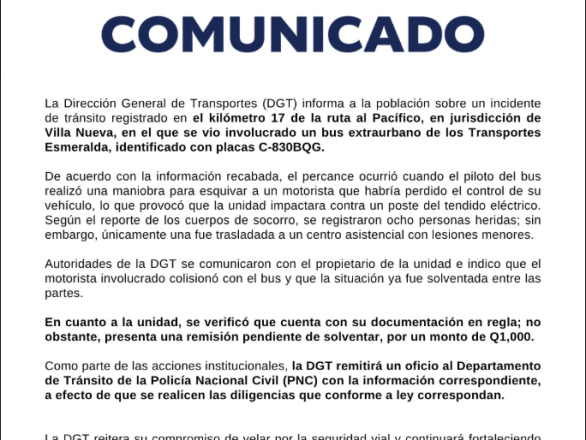 La Dirección General de Transportes (DGT) informa a la población sobre un incidente de tránsito registrado en el kilómetro 17 de la