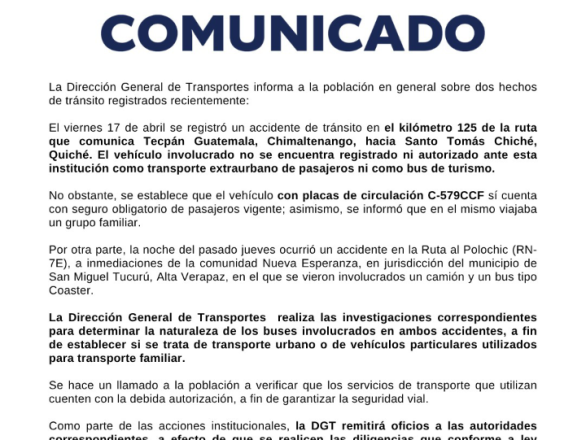 La Dirección General de Transportes informa a la población en general sobre dos hechos de tránsito registrados recientemente: El viernes 17 de