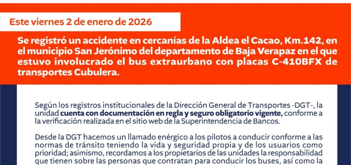 La noche de éste sábado 3 de enero de 2026, se registró accidente en el ingreso a la aldea San Juan Gascón, de la Carretera RN-10, bajada de “Las Cañas” ruta hacia Antigua Guatemala. Según información proporcionada la unidad de transporte cuenta con el número de placa C-571BQB. Como Dirección General de Transportes -DGT-: –Read more