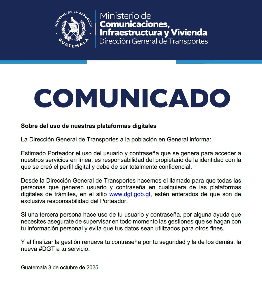 Desde la Dirección General de Transportes hacemos el llamado para que todas las personas que generen usuario y contraseña en cualquiera de las plataformas digitales de trámites, en el sitio www.dgt.gob.gt, estén enterados de que son de exclusiva responsabilidad del Porteador.