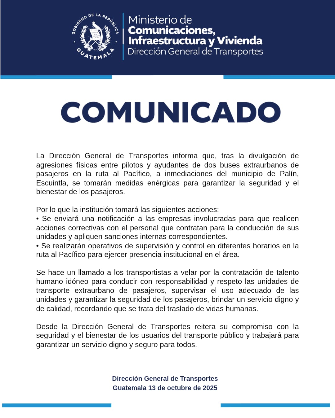 La Dirección General de Transportes informa que, tras la divulgación de agresiones físicas entre pilotos y ayudantes de dos buses extraurbanos de pasajeros en la ruta al Pacífico, a inmediaciones del municipio de Palín, Escuintla, se tomarán medidas enérgicas para garantizar la seguridad y el bienestar de los pasajeros.