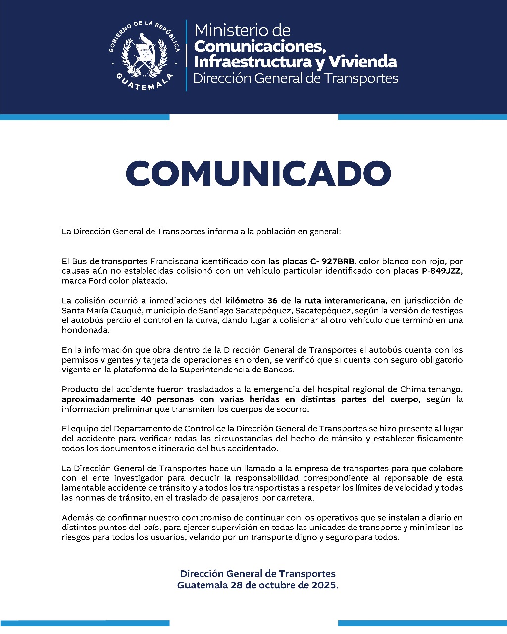 Producto del accidente fueron trasladados a la emergencia del hospital regional de Chimaltenango, aproximadamente 40 personas con varias heridas en distintas partes del cuerpo, según la información preliminar que transmiten los cuerpos de socorro.