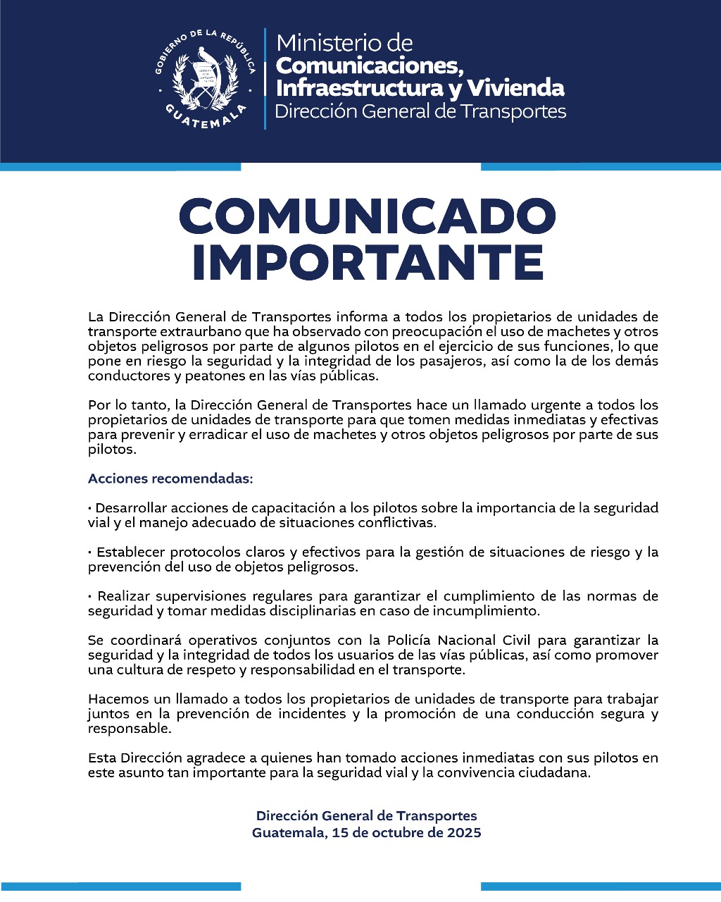 La Dirección General de Transportes informa a todos los propietarios de unidades de transporte extraurbano que ha observado con preocupación el uso de machetes y otros objetos peligrosos por parte de algunos pilotos en el ejercicio de sus funciones, lo que pone en riesgo la seguridad y la integridad de los pasajeros, así como la de los demás conductores y peatones en las vías públicas.