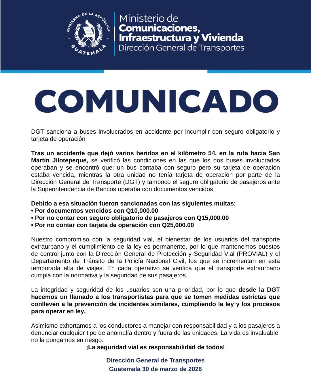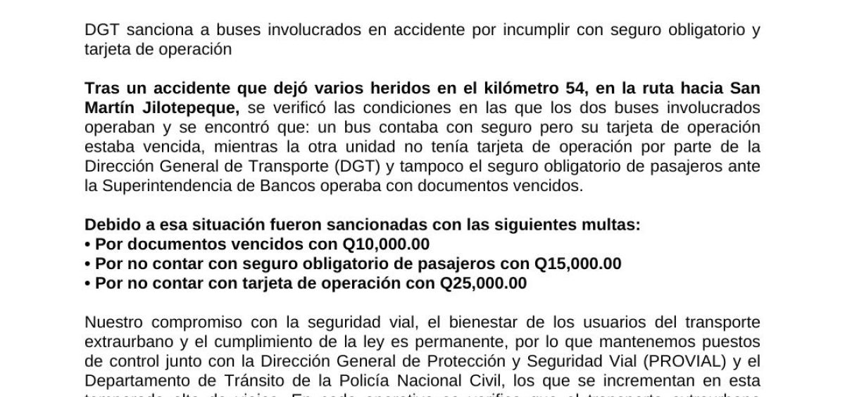 Tras un accidente que dejó varios heridos en el kilómetro 54, en la ruta hacia San Martín Jilotepeque, se verificó las condiciones en las que los dos buses involucrados operaban y se encontró que: un bus contaba con seguro pero su tarjeta de operación estaba vencida, mientras la otra unidad no tenía tarjeta de operación por parte de la Dirección General de Transporte (DGT) y tampoco el seguro obligatorio de pasajeros ante la Superintendencia de Bancos operaba con documentos vencidos.