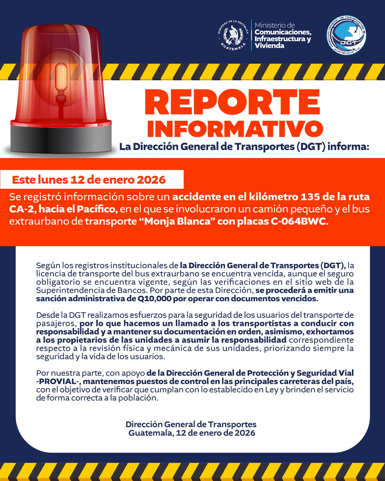 Este lunes 12 de enero de 2026, se registró información sobre un accidente en el kilómetro 135 de la ruta CA-2, hacia el Pacífico, en el que se involucraron un camión pequeño y el bus extraurbano de transporte “Monja Blanca” con placas C-064BWC.